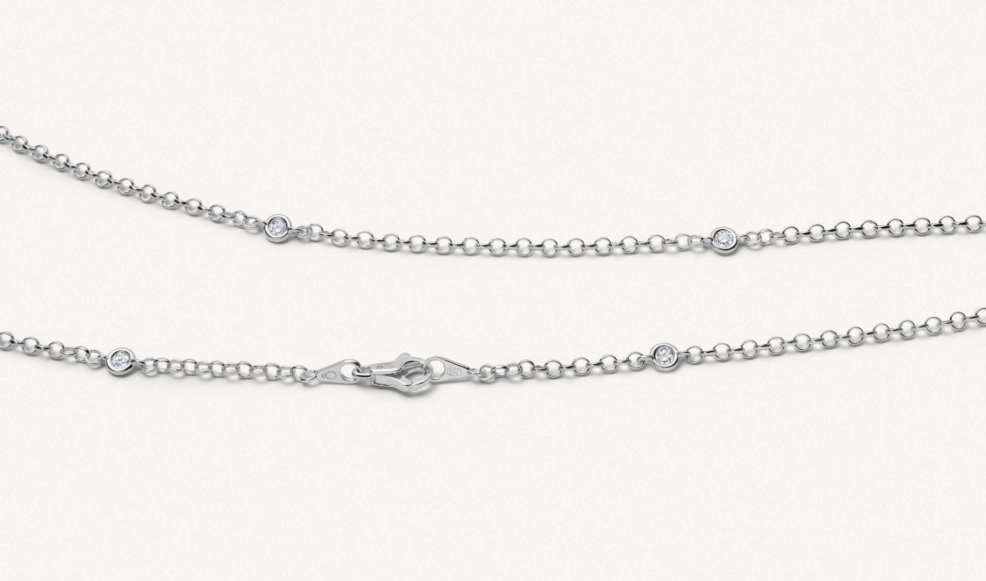 26" is crafted in 18k white gold with thirteen individually set Top Wesselton VVS diamonds. Made in Italy.
