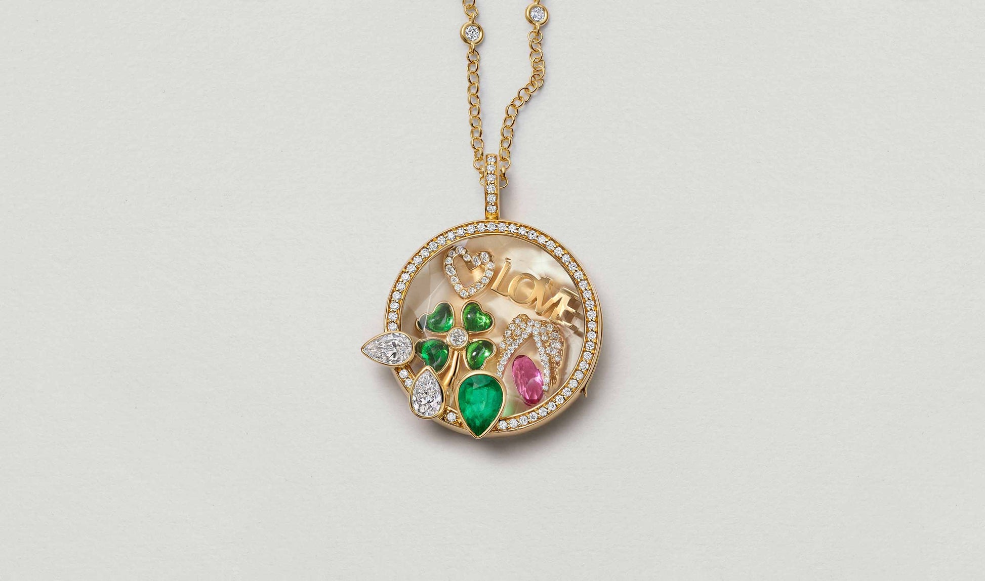 The Aurora Pear Trio Locket by Medailline is a radiant gold vermeil pendant framed with shimmering white sapphires and adorned with three pear-cut stones, including a vivid emerald-green centerpiece that symbolizes love and renewal. Designed with a faceted crystal window, this locket becomes a miniature world crafted just for you — a place to hold your most cherished memories close. Personalise it with the charms that reflect your journey, your milestones, and the people you treasure most. Elegant, modern, and deeply meaningful, the Aurora Pear Trio Locket elevates any look and pairs beautifully with our Belcher Chain for a timeless finish.