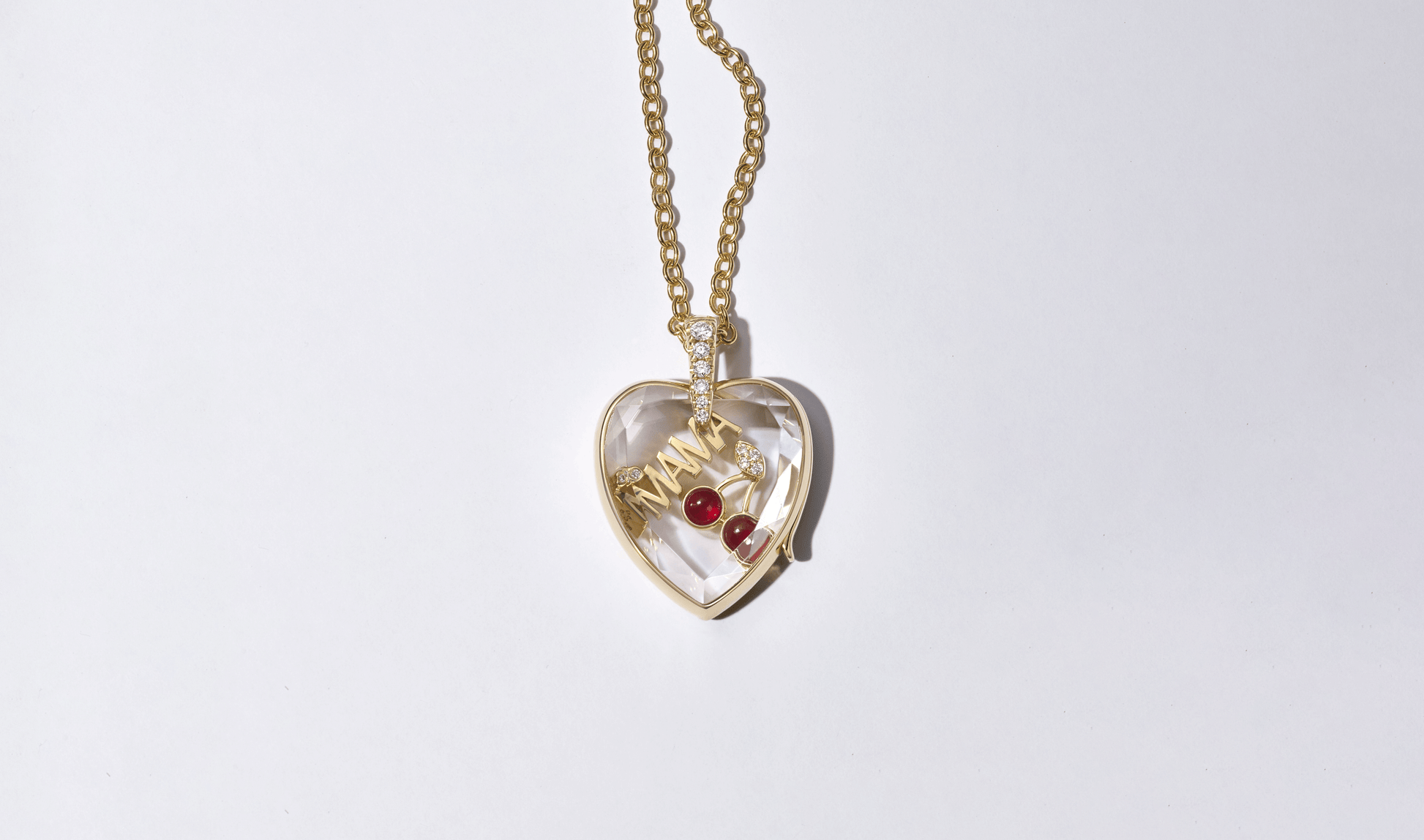 Our Amate Heart Locket handcrafted in 14k solid gold with diamond bale, curated with our Cherry Pick and Mama charms.